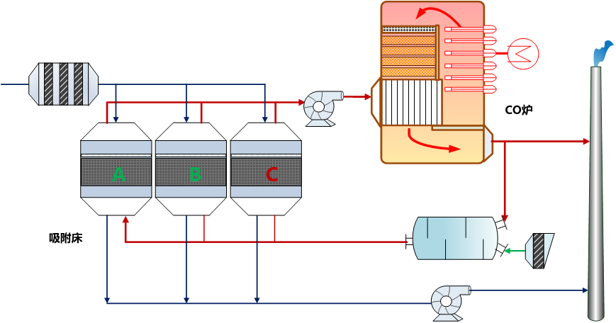 蜂窝活性炭将大风量、低浓度浓缩成小风量、高浓度有机废气,脱附产生的高浓度有机废气进入到催化燃烧设备进行氧化分解,最终分解为CO2和H2O。